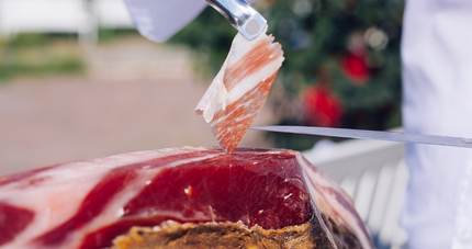 The 100% acorn-fed Iberian pata negra ham is produced and cured in a completely traditional way in natural drying sheds for a minimum of 36 months. It is almost unanimously the star product of Spanish gastronomy, being the highest quality ham and therefore the most expensive. It has a very aromatic, powerful umami flavour.